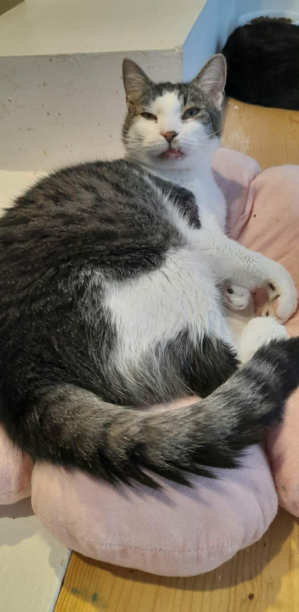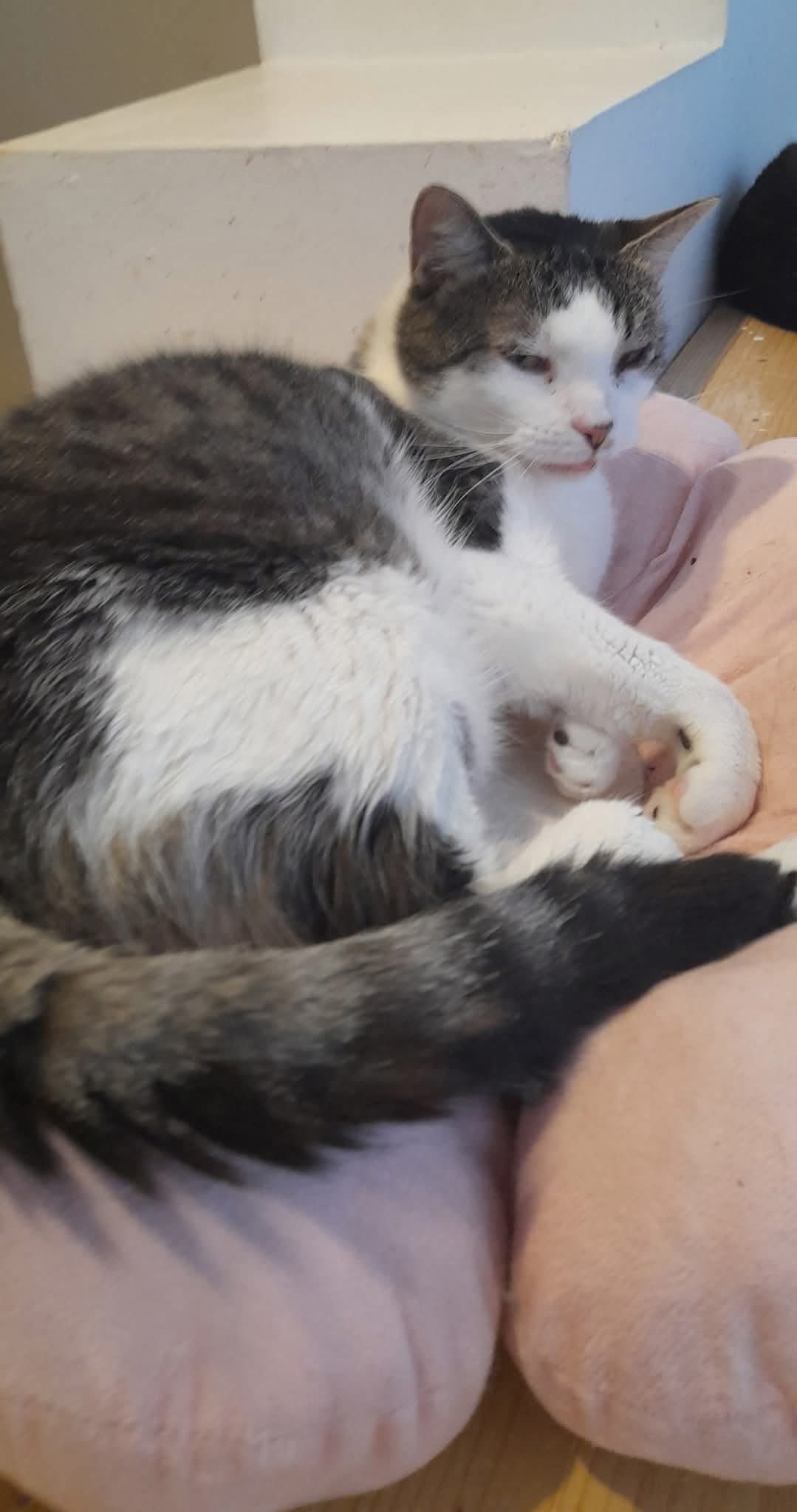 Wo ich gefunden wurde, weiss ich persönlich nicht. Zum jetzigen Zeitpunkt befinde ich mich aber in der Obhut der lieben Cristina. Cristina hat berichtet, dass ich nach der Kastration nicht richtig auf meinen Hinterbeinen laufen konnte, weshalb ich Infusionen bekam und behandelt wurde. Ihrer Aussage nach laufe ich jetzt nicht nur, nein, ich renne und tobe regelrecht umher, weil ich so eine Freude daran habe mit den anderen Katzen hier zu spielen!