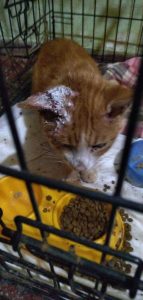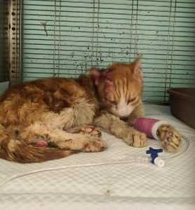 Bereits als wir im September zu Besuch waren fiel uns ein Kater auf, da er scheinbar eine Allergie oder Erkrankung an der Haut hat. Vor kurzem konnte Elena ihn einfangen und zum Tierarzt bringen. Dort wird er nun versorgt. Leider ist er nicht sehr kooperativ. Trotzdem haben sie es geschafft, die offenen Stellen an seinen Ohren zu versorgen. Damit die Wunden sauber bleiben und heilen muss er für die Therapie beim Tierarzt bleiben, was natürlich zusätzliche Kosten verursacht. Mittlerweile sind schon Kosten von 210€ angefallen – Tendenz steigend.